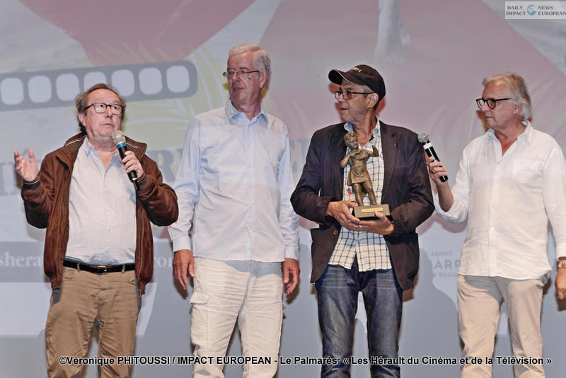 Husky Kihal reçoit un Cesarion pour -Cash-Cash-, Philippe du Janerand (G), un membre du Jury et Jean Louis Abadie (D)- Les Herault du Cinéma et de la Télévision au Palais des Congrès du Cap d’Agde, 2019