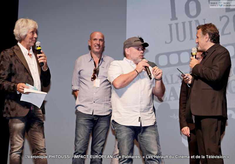 Patrick Jorge (G), un acteur et Olivier Megaton, président du Top des Courts et Michel La Rosa (C) – Les Herault du Cinéma et de la Télévision au Palais des Congrès du Cap d’Agde, 2019
