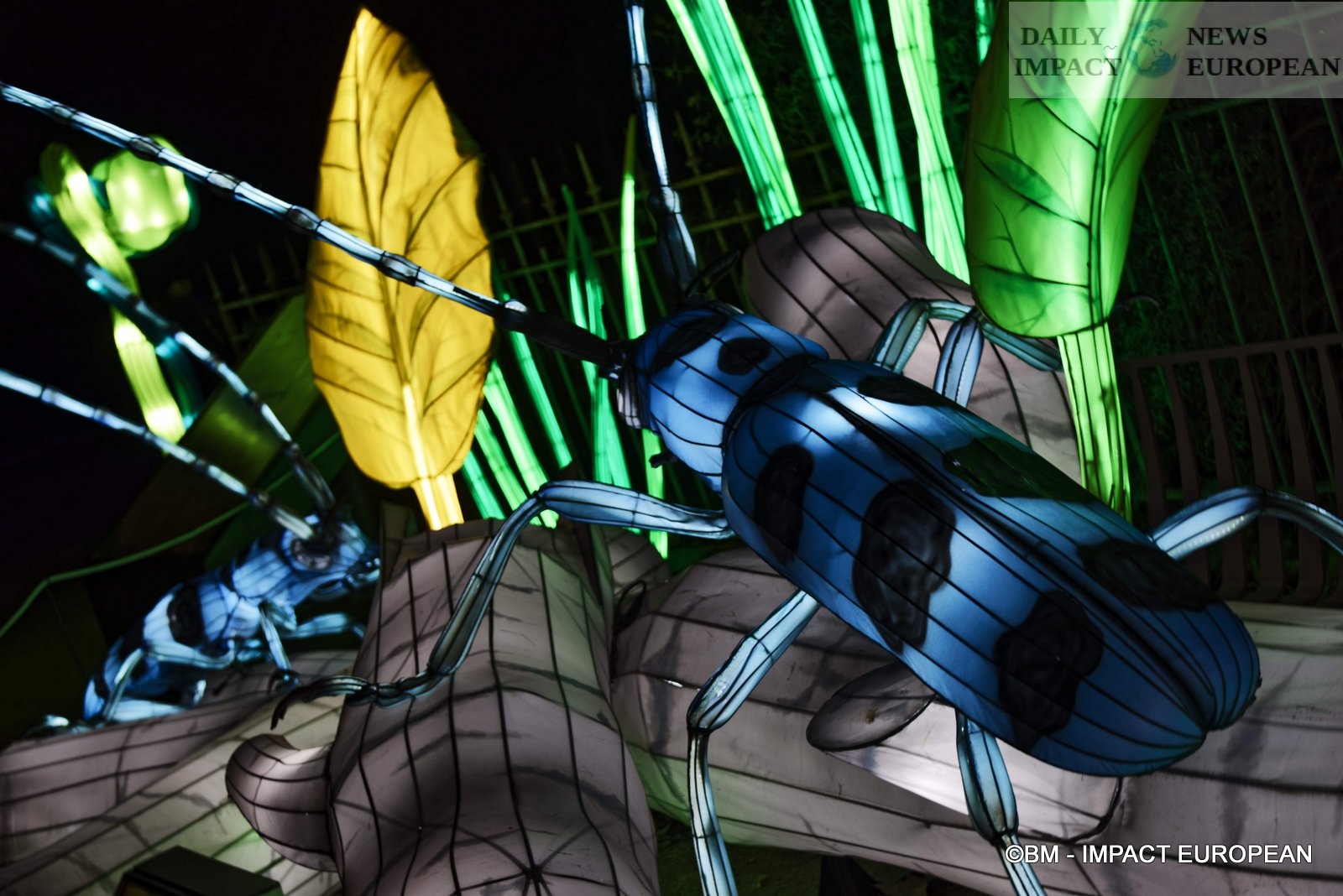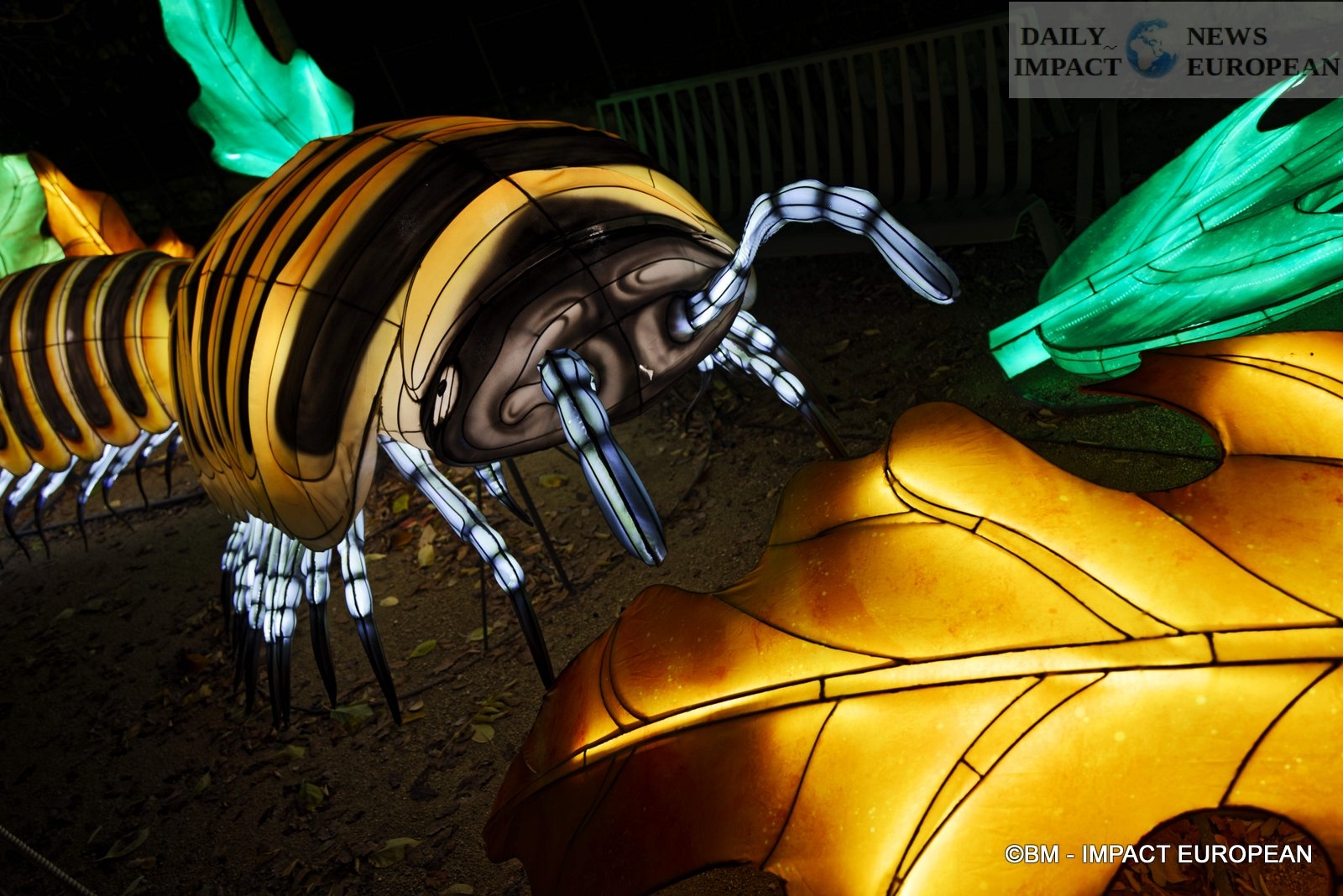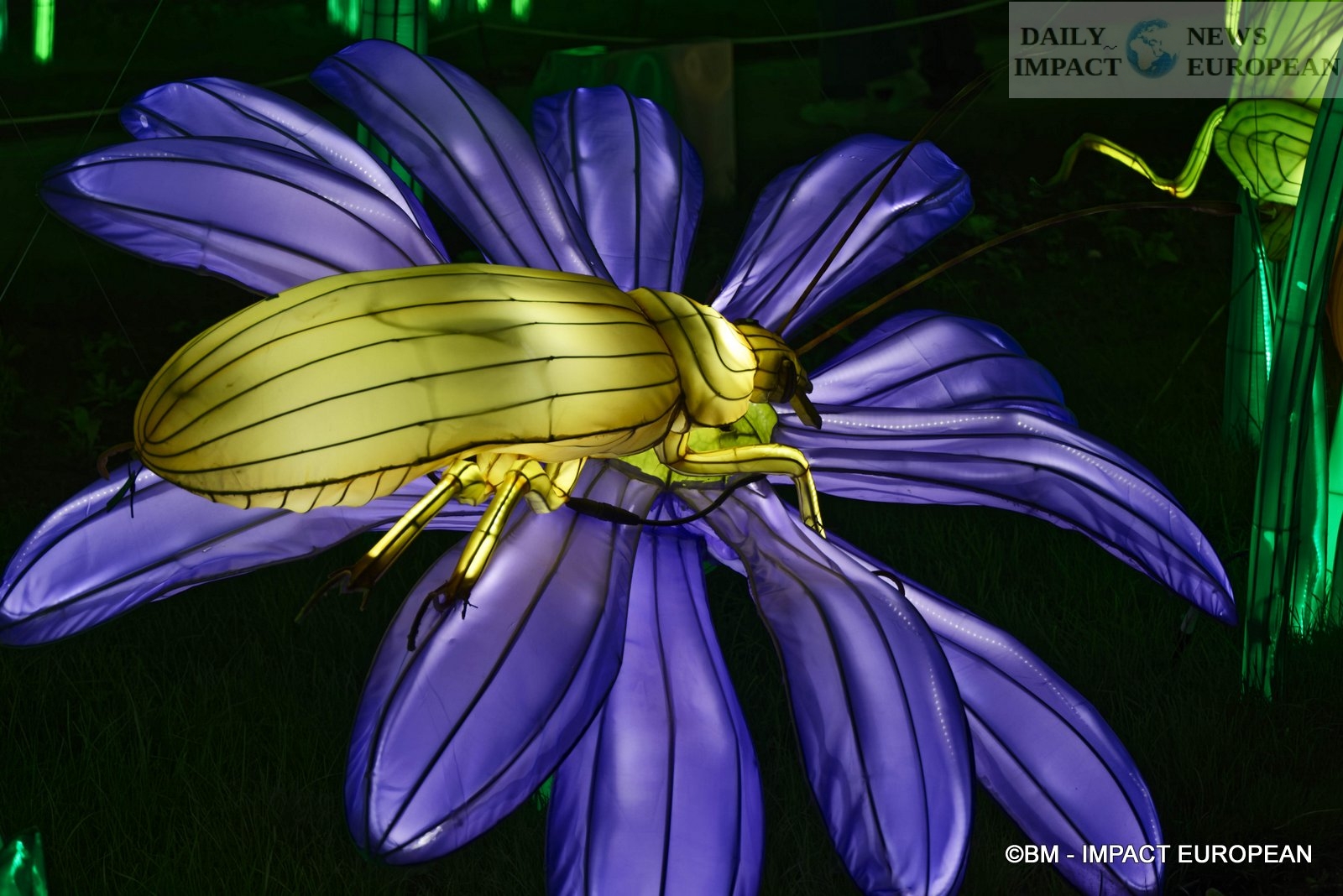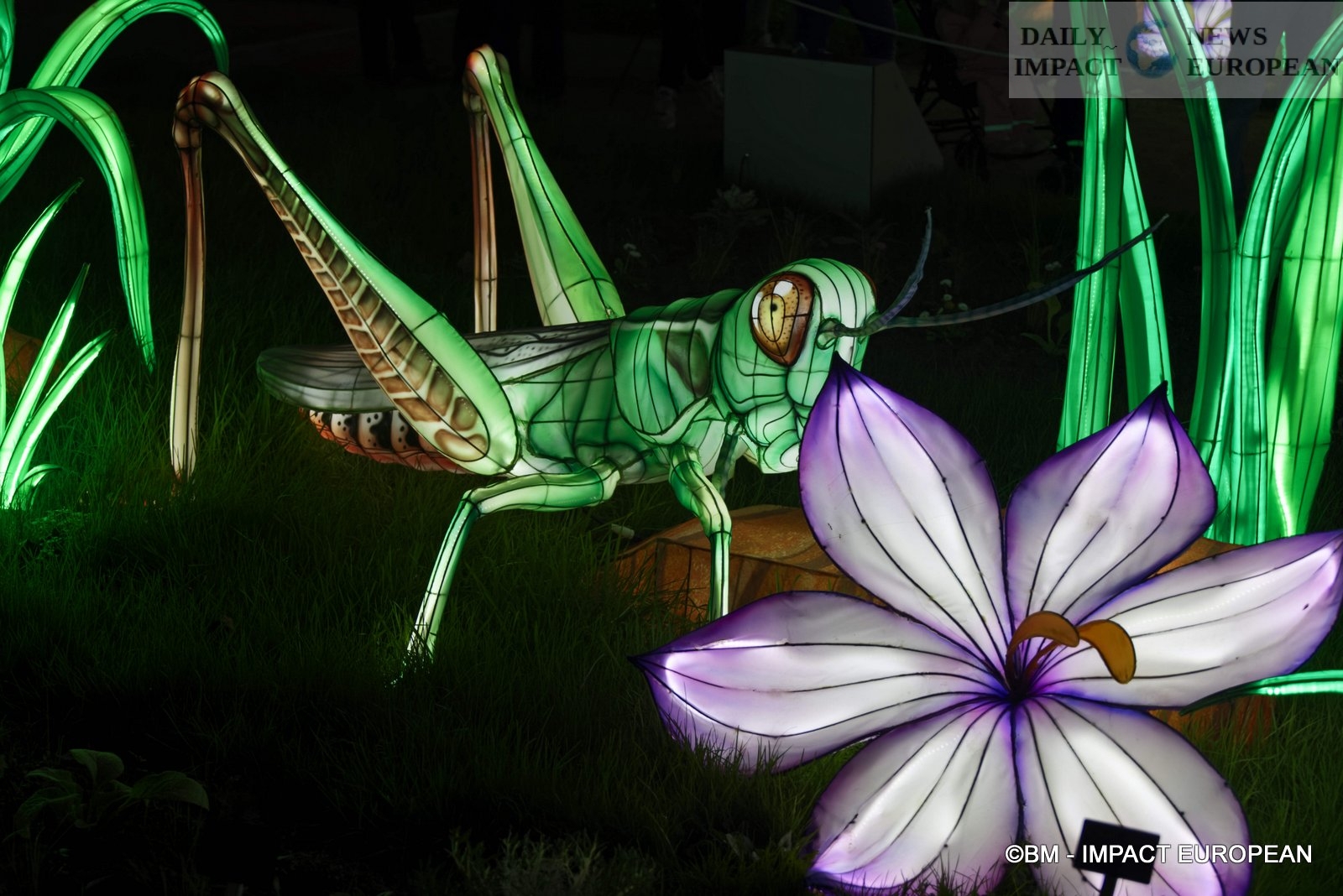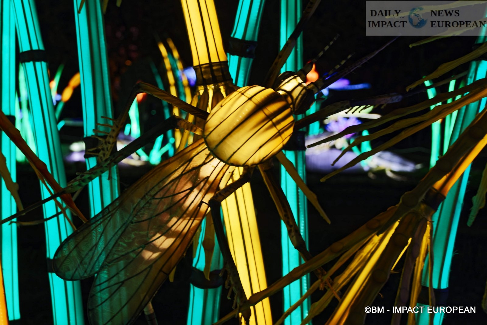 Taking into account energy sobriety, the scientists of the Museum designed the story, the scenario and all the structures. The Chinese partner (Lantern Festival) has produced, using the traditional technique, all the structures made of metal and painted fabrics to give finesse to all the insects, plants and animals represented. The set is equipped with LEDs to have a limited energy cost.