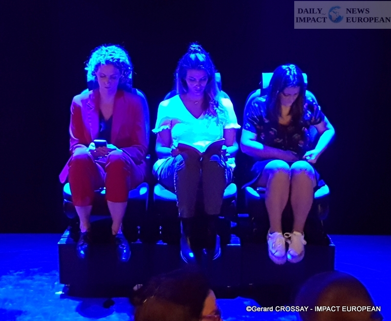 We are in an airliner. Facing the spectators, three women sitting in their seats. They engage in conversation, first on banalities, then little by little, on increasingly personal remarks relating to the romantic encounter.